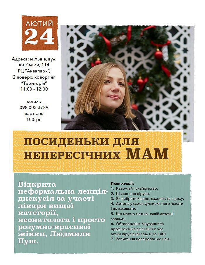 Лекцію проведе лікар-неонатолог вищої категорії, Людмила Пуш. Гарна нагода завести цікаві знайомства та підняти важливі теми!