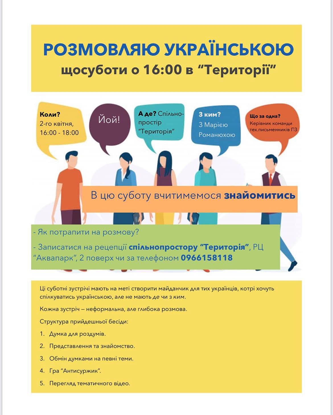 Стартуємо із практикуванням української в @territorycoworking (2 поверх Аквапарку “ПЛЯЖ”) вже цієї суботи, 2ого квітня, 2022 року.