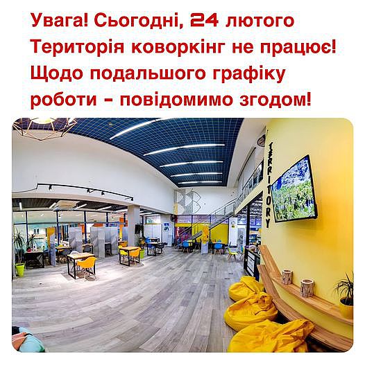 НовиниУвага! 24 лютого Територія коворкінг не працює. Щодо подальшого графіку роботи – повідомимо згодом!24.02.2022by admin0 Views0CommentsTwitterFacebookLinkedin6 Likes